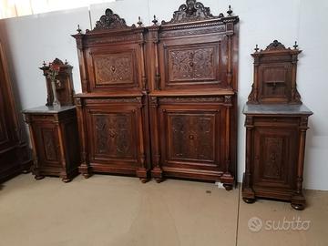 Letto matrimoniale divisibile in due letti singoli, con testiera e pediera intagliate. Dim. 180x220 h 189 cm. Sponde da 200 cm.