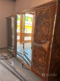 In legno lucido. Comprende: - letto matrimoniale - armadio con specchio - 2 comodini con spglia in marmo - 1 como’/consolle con soglia in marmo e specchio