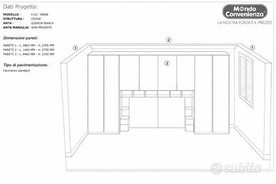 Camera da letto completa Mondo Convenienza modello V132 Irene, colore Quercia Bianca con struttura Visone. Prezzo trattabile. Composizione composta da: armadi laterali e pensili sopra il letto vano centrale con mensole aperte letto matrimoniale imbottito colore panna testiera imbottita 4 mensole laterali aperte Misure parete: circa 446 cm larghezza x 270 cm altezza. Usata pochissimo perché presente nella stanza degli ospiti. La camera è in ottime condizioni, moderna, molto capiente e ideale per sfruttare al massimo lo spazio. Vendo per cambio ristrutturazione.