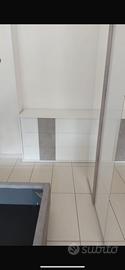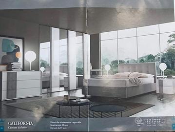 Camera da letto completa colore bianco lucido e grigio, letto contenitore, armadio 6 ante con specchi integrati, comó, due comodini e specchio. Usata solo 1 anno già smontata e imballata