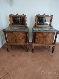 Mobili in radica con lavorazioni artigianali, piedi torniti e dettagli a colonnina.
