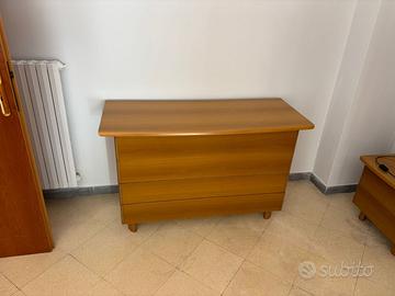 Vendesi camera da letto completa in finitura legno color ciliegio/noce chiaro, dal design classico e lineare, ideale per arredare con calore e funzionalità. Tutti i mobili sono in ottime condizioni estetiche e strutturali.