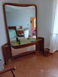 Vendo bella camera da letto in legno con letto matrimoniale e comodini + armadio con specchi + cassettone + mobile angolare per trucco + due grandi sedie imbottite.