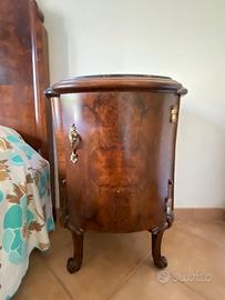 Regalo camera da letto antica dei primi del 1900, interamente fatta a mano e rivestita in noce. Testata e giro letto, due comodini, comò con specchiera e armadio a tre ante con specchio centrale. Rete a doghe fatta su misura. Sui comodini e sul comò piani di marmo nero pregiato. Ritiro a casa