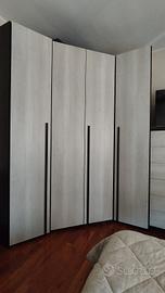 Vendesi camera da letto moderna colori vulcano e legno chiaro, composta da armadio a ponte con due ante battenti laterali con maniglia, due ante battenti superiori con apertura a gola, due cassettiere da 6 cassetti ciascuna molto capienti, una cabina armadio con specchio interno misura XL e due colonne armadio di cui una ad angolo. In aggiunta letto contenitore imbottito color tortora (no materasso). prezzo trattabile. Smontaggio e trasporto a carico dell'acquirente.