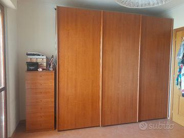 Camera completa ciliegio Mondo Convenienza composta da armadio 3 ante scorrevoli L 270 H 245 P 60 con ripiani x biancheria 2 cassettiere da 2 cassetti cad. interne all armadio 4 tubi appendi abiti. 1 settimino 2 comodini 1 letto matrimoniale a cassettone completo 170×200×100. Come in foto Già smontata e ben conservata. Ritiro Zona Laurentina/Pomezia Piano Terra Possibilità di ritiro anche sabato pomeriggio o domenica. Ottimo affare per casa vacanze. Vendo anche singoli pezzi