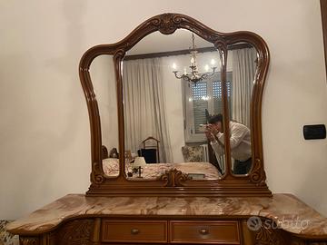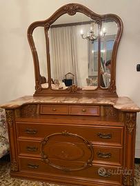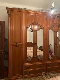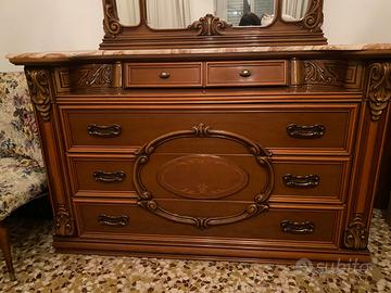 Camera da letto comprendente due comodini in legno con ripiano in marmo, comó in legno con ripiano in marmo, armadio 6 ante con specchio e 4 cassetti, letto. Stile anni 70-80