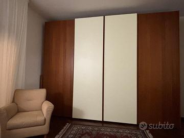 Composta da letto matrimoniale con testiera in legno, armadio capiente con ante scorrevoli ed all'interno accessoriato di porta pantaloni e due cassetti in acciaio, due comodini coordinati con cassetti e ampia cassettiera con specchio abbinato, poltrona di colore beige. Tutti gli elementi sono funzionali, con cassetti e ante che scorrono perfettamente.