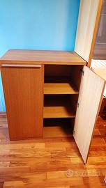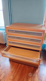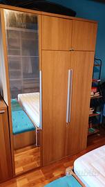 Camera da letto composta da letto matrimoniale con testiera, comodini e doghe e due scomparti contenitori alla base del letto, tre armadi, di cui uno singolo con specchio, una cassettiera e un armadio basso.