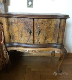 Vendo set completo composto da: letto matrimoniale con testata e pediera in legno lavorato, due comodini coordinati e comò con grande specchiera. Legno in radica di noce, stile elegante e curato nei dettagli, tipico della produzione italiana anni ’30–‘50.