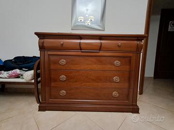 camera da letto in vero legno stile classico completa di armadio a 5 ante, comò con tre cassetti, 2 comodini con due cassetti e un letto contenitore matrimoniale. il tutto visibile in foto.