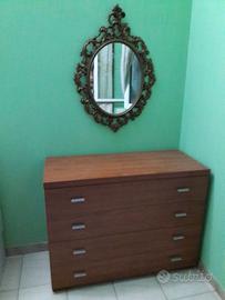 letto singolo con sponde in legno e rete in legno a doghe larghe, comò ( di colore ciliegio ) a quattro cassetti, specchio " antico " in legno.Compreso nel prezzo, una radio sveglia Philips, una lampada Bajur, un tappeto Di piccole dimensioni ed una stufa elettrica.