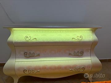 Camera da letto in stile contemporaneo composta da letto in ferro battuto 2 comodini e comò illuminato con luce led , tutto in legno massello realizzato da un’azienda toscana marca Bova. In perfette conzioni pari al nuovo.
