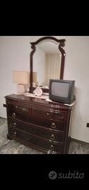 Camera da letto composta da comò in mogano e piuma di mogano composti specchio annesso, 2 comodini stessa linea sempre in mogano 1 poltrona e armadio a 6 ante e letto in bagno d'Oro zecchino anticato di marca TANZI