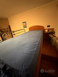 Camera da letto in legno, dotata di un letto ad una piazza e mezza (scomponibile dalla camera) e un letto singolo rialzato accessibile da ampi gradoni apribili e contenitivi. La struttura è sostanuta da un armadio a due ante e una madia (fondo azzurro) molto ampia e contenitiva.