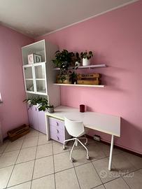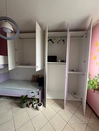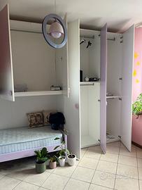 CAMERA COMPRESA DI: 2 LETTINI SINGOLI CON MATERASSA, 2 COMODINI, AMPIO ARMADIO, scrivania, mensole, mobile con vetrina e sedia. Le scale per salire al lettino superiore si possono aprire ed usare come contenitori.