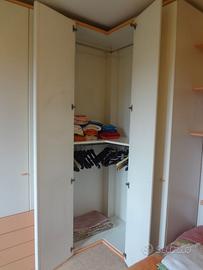 Camera con letto singolo, armadio ad angolo con cassettiera, mobile a libreria con scrivania a penisola e 3 mensole, di colore bianco e rosa.