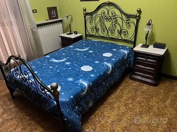 camera da letto in arte povera con letto 1 piazza e mezza a doghe e piano cassettiera e comodini con marmo rosa.