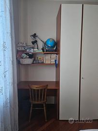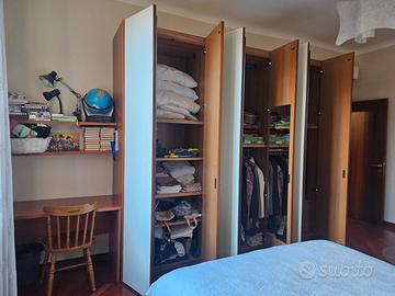 Vendo camera da letto fatta da un mobiliere in legno ciliegio. La camera è composta da letto matrimoniale (con testata in tessuto da mettere con velcro), cassettiera/comò, 2 comodini, armadio, scrivania, 2 mensole, il tutto in perfetto stato come da foto.