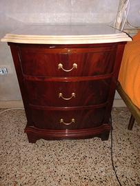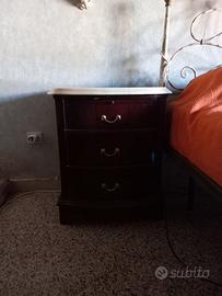 Camera da letto completa di armadio corredato di cassetti interni, letto in ferro battuto completo di rete a doghe, comodini in mogano e marmo e comò a quattro cassetti. Vero affare in ottimo stato.