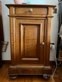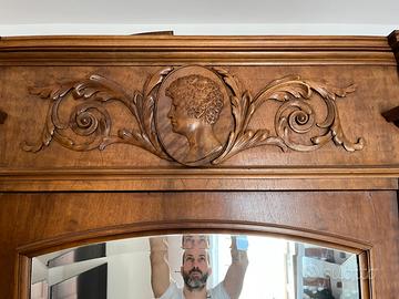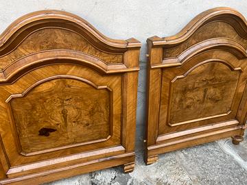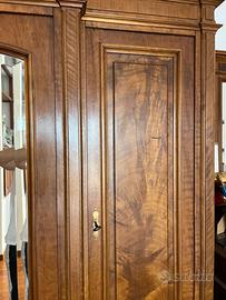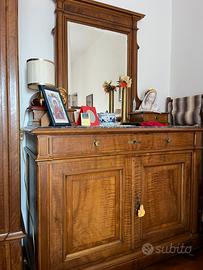 Camera da letto completa in legno di noce massello, fatta a mano. Completa di: - armadio a 3 ante e 3 cassetti con specchio - comó con ante e cassetto + specchio - 2 comodini - testiera letto - rete matrimoniale 166x190