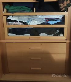 Camera da letto in legno tamburrato color ciliegio composta da armadio 6 ante (2 vetri satinati centrali e specchi interni, 2 cassettiere e portacamicie), comò con quattro cassetti e specchio annesso, due comodini da tre cassetti. Prezzo trattabile.