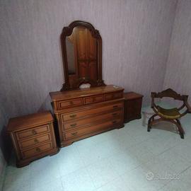 Camera da letto in noce con intarsi completa di armadio 4 stagioni con 2 ante a specchi e 3 cassetti, lunghezza cm 300, larghezza cm 60 ed altezza cm 262; sedia Luigi XVI; comò con specchio e 6 cassetti lunghezza cm 137, larghezza cm 55, altezza cm 85, lo specchio altezza cm 118; 2 comodini con 3 cassetti lunghezza cm 57, larghezza cm 41 ed altezza cm 58. Smontaggio e trasporto a carico dell'acquirente. Vendibili anche separatamente, prezzo trattabile. Roma zona Largo Preneste. Anna