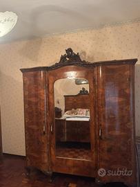 stanza in radica composta da letto matrimoniale, 2 comodini con parete superiore in marmo, comò con parte superiore in marmo e grande specchio,armadio con specchi