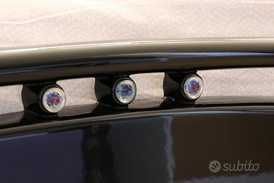 Camera da letto in stile retrò colore nero e radica blu lucido, completa di armadio ad ante scorrevoli a specchio e faretto su cappello, comò, comodini con maniglie in Swarovski, letto con inserti in vetro di Murrina e specchiera.