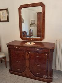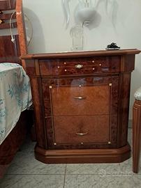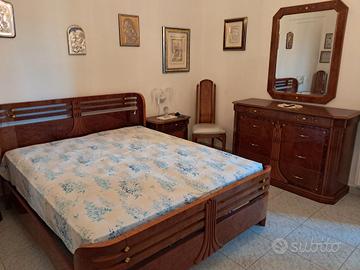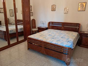 Camera da letto in radica color noce chiaro. Composta da letto matrimoniale, 2 comodini, 2 sedie, comò con specchiera e armadio a 6 ante con specchi. In ottime condizioni. Smontaggio e trasporto a carico dell'acquirente.