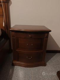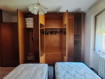 Camera in legno scuro composta da 2 letti singoli , armadio , 1 comodino , cassettiera con specchio