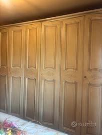 Camera in legno massiccio con decori armadio 6 ante , 2 comodini 1 cassettiera. Letto di ottone smaltato ,buone consizione mancano solo 3 piccole copri serrature