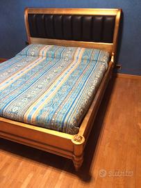 Letto in legno finitura foglia oro, imbottitura pelle pieno fiore comprensivo di rete rete con doghe in legno.