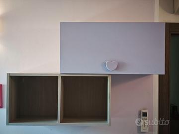 4) Composizione appesa con un "cubo" (con separatori interni) 40x40x32 cm e due parallelepipedi (di cui uno chiuso da sportello con pistoncini) da 80x40x32 cm.
