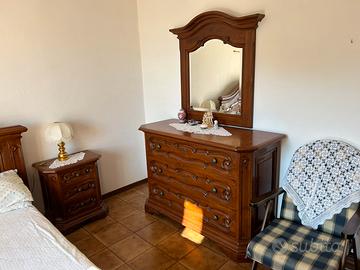 Camera da letto completa di letto, comodini, comò, specchio e armadio.