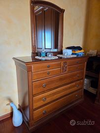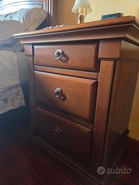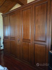 Camera da letto in massello di noce nazionale alto spessore composta da: armadio 4 ante L.300 H.256 cm, comò L.140 cm, letto e due comodini. Frontali in massello con intarsio, fianchi tamburati impiallacciati noce. Qualità alta e ottime condizioni. Possibilità di accordo per trasporto e montaggio.