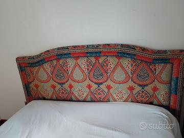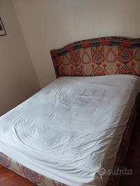 Vendo letto matrimoniale con testiera tessuto in fantasia, completa di 1 comodino in legno. Dettagli in foto. No perditempo, no affaristi.