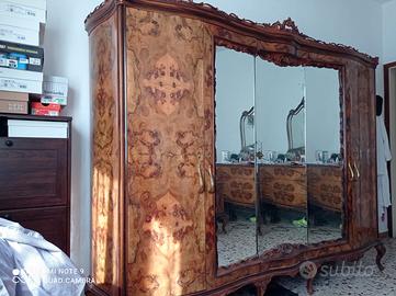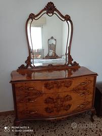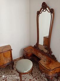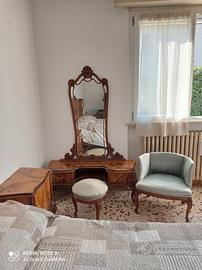 Camera composta da: letto matrimoniale, coppia di comodini, cassettiera con specchiera, armadio 4 ante, pettiniera con specchio e sgabello, coppia di poltrone.