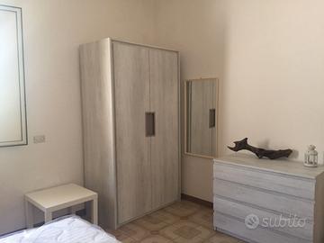 Vendo camera da letto matrimoniale composta da giro letto con doghe in legno, testiera staccata da fissare al muro. Due comodini. Una cassettiera e un armadio con cassetti interni. Materasso escluso. Tutto già smontato. Sono disponibili due camere complete. Prezzo per una camera completa euro 700. Per tutte e due insieme 1200 euro.