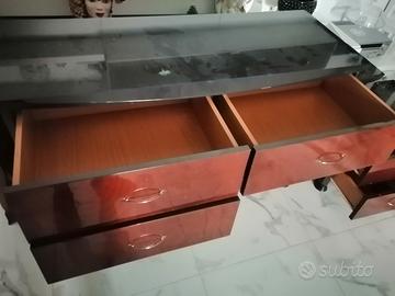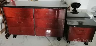 Colore vinaccia e nero laccato. Spalliera con tavolini estraibili, 2 ante scorrevoli con specchio. La camera si trova già smontata. Misure armadio L278xP62xh260. Comó 6 cassetti L138xP55xh80.