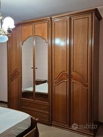Letto matrimoniale con testiera solida, armadio a 5 ante con due specchi centrali e due cassetti inferiori.