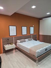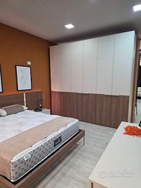 La composizione comprende armadio capiente con ante rallentate, letto con testata scenografica e comò coordinato.