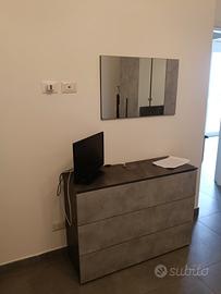 Vendesi splendida camera da letto completa dal design contemporaneo e minimalista. La combinazione cromatica tra il grigio effetto cemento/pietra delle superfici e i dettagli scuri rende questo set perfetto per chi cerca uno stile moderno ed elegante.