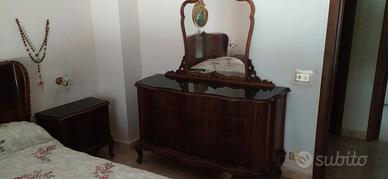 Camera da letto matrimoniale in noce stile anni '50 composta da armadio, letto matrimoniale con rete, materassi, testata e pediera, comò, 2 poltroncine, 2 comodini e lampadario. No spedizione. Smontaggio e ritiro in loco.