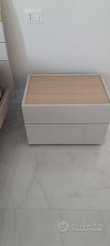 Camera da letto colore madreperla liscio opaco composta da: 1 rete a doghe cm 160x200. 1 letto jokermater madreperla liscio opaco con piedi interni, con fascia testata color rovere sabbia 160 x 200. 2 comodini hastag L 59 H 41,3. 1 comò L 125,3 H 1,5. 1 armadio con 3 ante scorrevoli ( 2 ante tablet con fasce color rovere sabbia, 1 anta centrale specchio vetro)