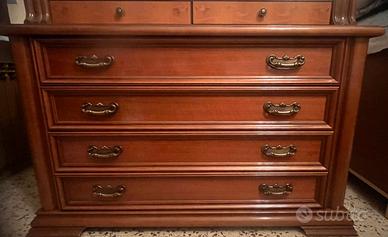Vendo camera da letto matrimoniale, legno massiccio scuro,dotata di n.2 comodini con 3 cassetti, letto con testiera e doghe,materasso matrimoniale,comò con 4 cassetti lunghi e due più piccoli sopra, specchio della stessa finitura del letto ed armadio 5 ante con bastoni per appendere e 3 cassetti.