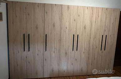 H.41, armadio 7 ante completamente scaffalato con 1 cassettiera a 3 cassetti, possibilità di montaggio tubi metallici per appendere in dotazione L.320 P.55 H.213 e 6 mensole. Smontaggio e trasporto a carico dell'acquirente. 1000 euro non trattabili, astenersi sognatori e perditempo.