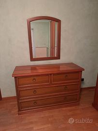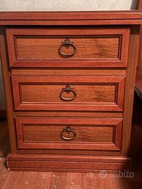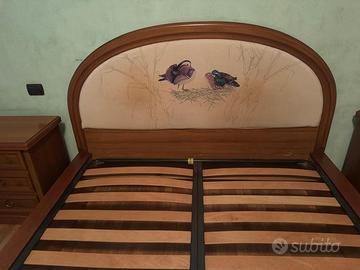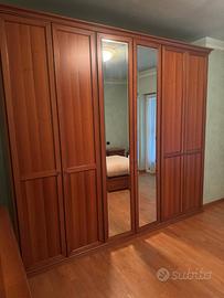 Camera da letto in legno come da foto. Composta da: armadio 6 ante con ripiani e cassettiera interna (misure: L 280cm, H 250cm, P 58cm), comò con 3 cassettoni (misure: L 142cm, H 90cm, P 54cm), due comodini (misure: L 55cm, H 64 cm, P 40cm) e letto matrimoniale con doghe in legno e due cassettoni. Già smontata e pronta al ritiro.