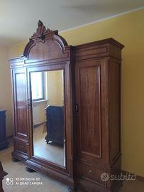 Vendo camera da letto matrimoniale completa vintage (stile liberty - fine ‘800) composta da letto matrimoniale (esclusi materassi e reti), coppia di comodini, comò con specchiera, armadio 3 ante. Comò e comodini hanno il piano superiore in marmo venato grigio. La camera è stata restaurata di recente ed è in ottime condizioni; attualmente è smontata per esigenze di ristrutturazione dell’edificio. Il prezzo è trattabile. Ritiro diretto a carico del compratore.