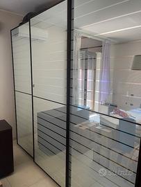 Camera da letto completa di armadio, due comodini e un armadio grande a specchio serigrafato e con 3 ante scorrevoli. Ottimo stato. Materasso escluso Misure letto : 164 x h253 x 60 cm Misure Como : 120 x 50 x h 80 cm Misure comodini : 46x 60 x h45 cm Vendo causa trasferimento. I mobili al momento sono ancora montati e disponibili a vederli dal vivo. Ma verranno smontati a breve. Prezzo trattabile.
